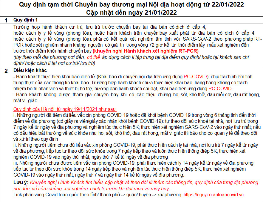 Quy định Hành khách trên các chuyến bay Nội địa, từ 22.01.2022