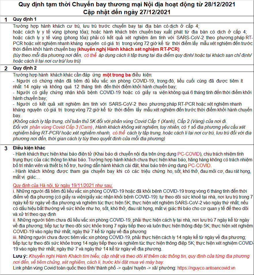 Quy định tạm thời Chuyến bay Nội địa hoạt động từ 28/12/2021